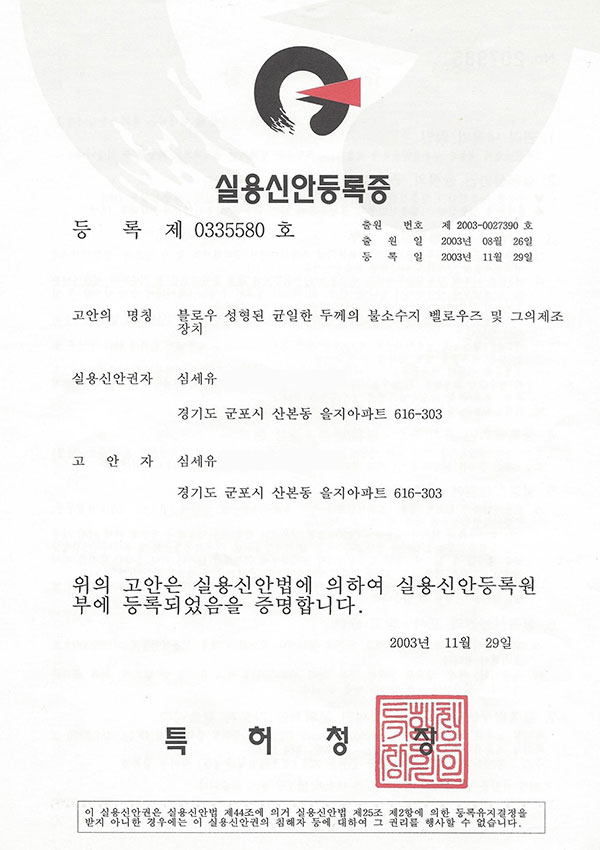 특허증 블로우 성형된 균일한 두께의 불소수지 벨로우즈 및 그의제조장치 등록 제0335580호