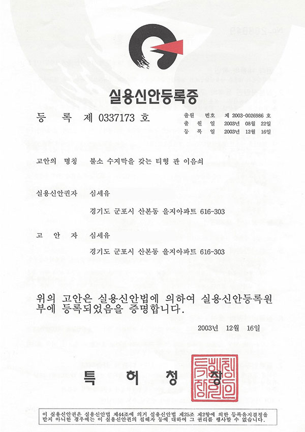 Patent Certificates T-shaped Pipe Fitting with Fluororesin Membrane Registration No.0337173